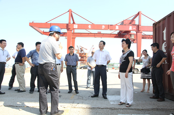 圖為長(zhǎng)沙集星集裝箱碼頭有限公司總經(jīng)理助理周勇(前左一)在向長(zhǎng)沙市政協(xié)黨組副書記、副主席鐘新蓮(前右一)、長(zhǎng)沙市開福區(qū)區(qū)委書記李蔚(前右二)介紹長(zhǎng)沙新港目前的集裝箱業(yè)務(wù)情況。 2013年7月11日上午,長(zhǎng)沙市政協(xié)黨組副書記、副主席鐘新蓮在長(zhǎng)沙市開福區(qū)區(qū)委書記李蔚的陪同下,就現(xiàn)代物流業(yè)發(fā)展情況來(lái)長(zhǎng)沙新港視察調(diào)研。湖南長(zhǎng)沙新港有限責(zé)任公司董事、財(cái)務(wù)總監(jiān)趙赤書,長(zhǎng)沙集星集裝箱碼頭有限公司總經(jīng)理助理周勇出席接待。鐘新蓮副主席對(duì)港口建設(shè)及港口目前的發(fā)展情況等一系列問(wèn)題進(jìn)行了深入考察。 |