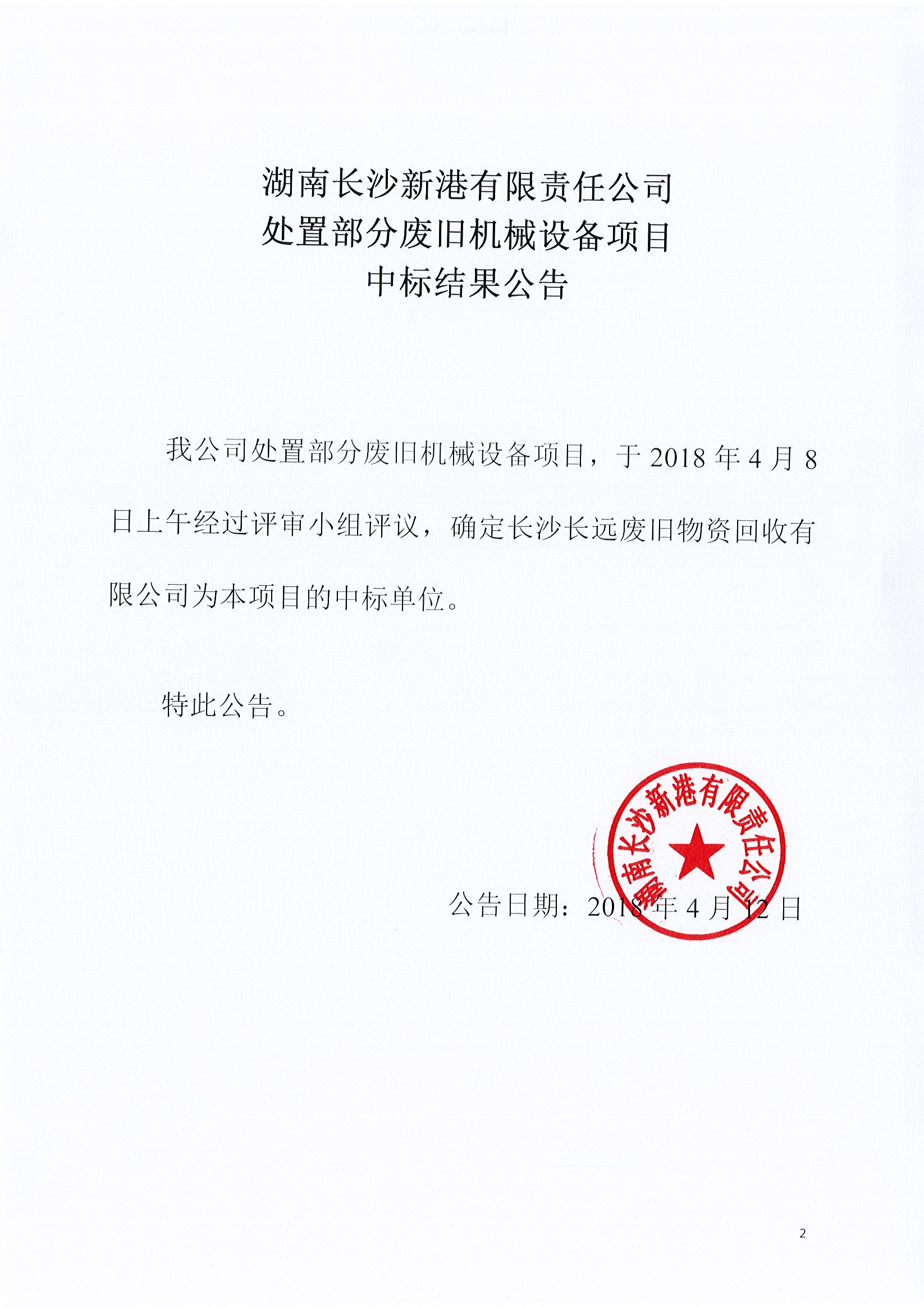 湖南長沙新港有限責(zé)任公司 處置部分廢舊機(jī)械設(shè)備項目中標(biāo)結(jié)果公告