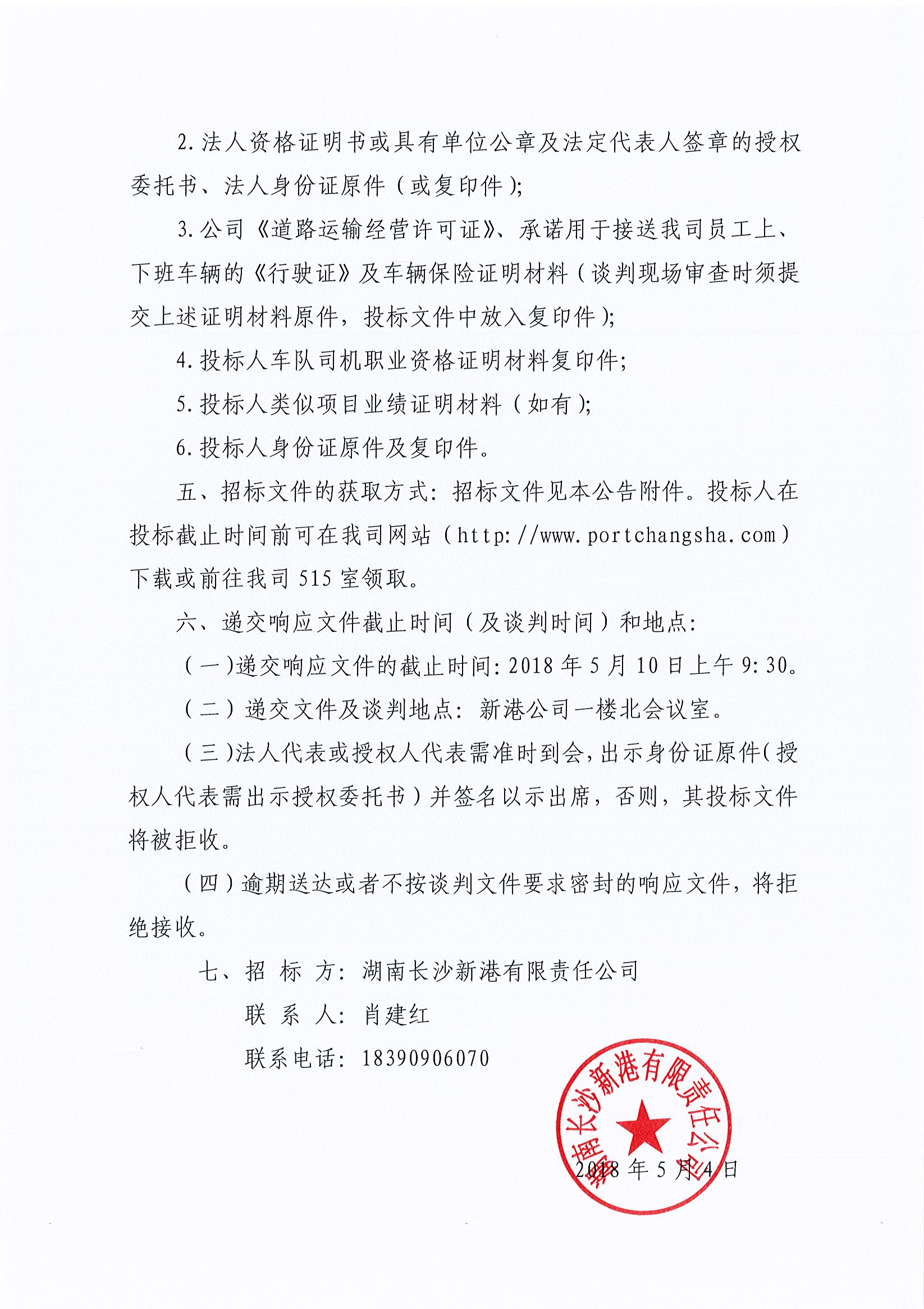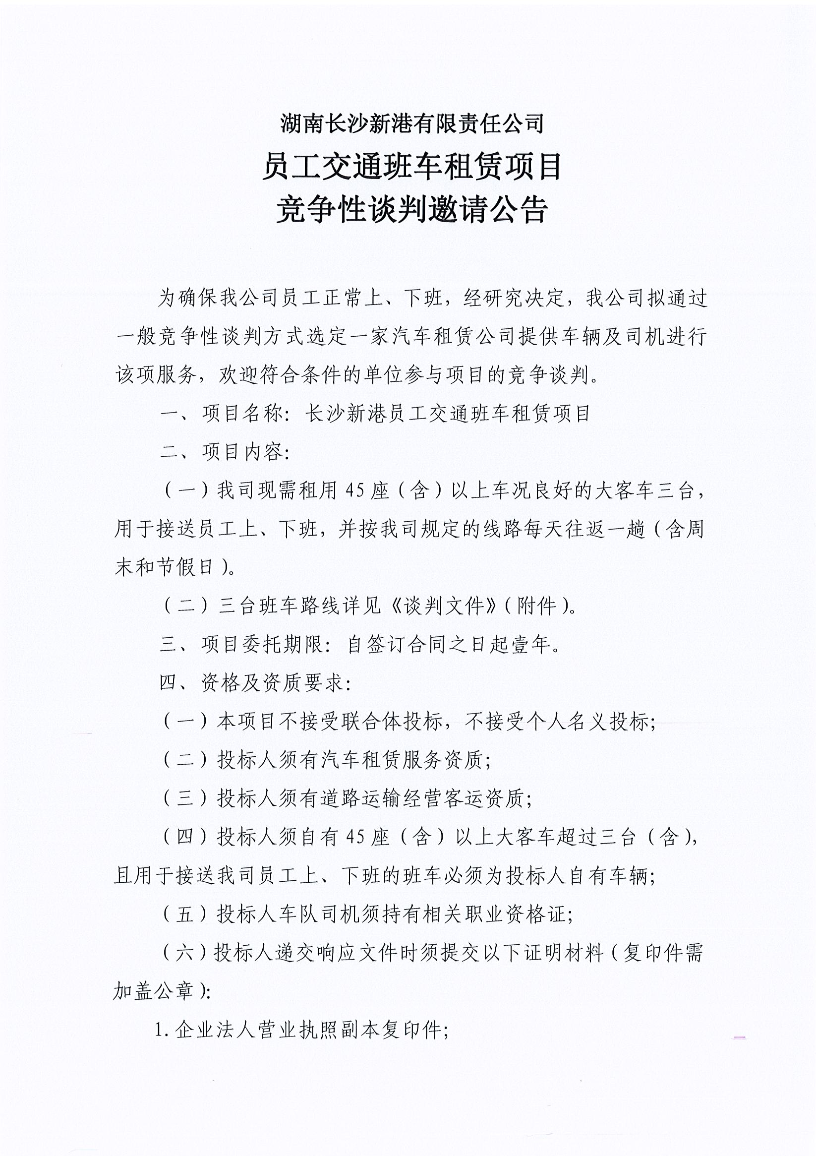 湖南長沙新港有限責任公司 員工交通班車租賃項目競爭性談判邀請公告