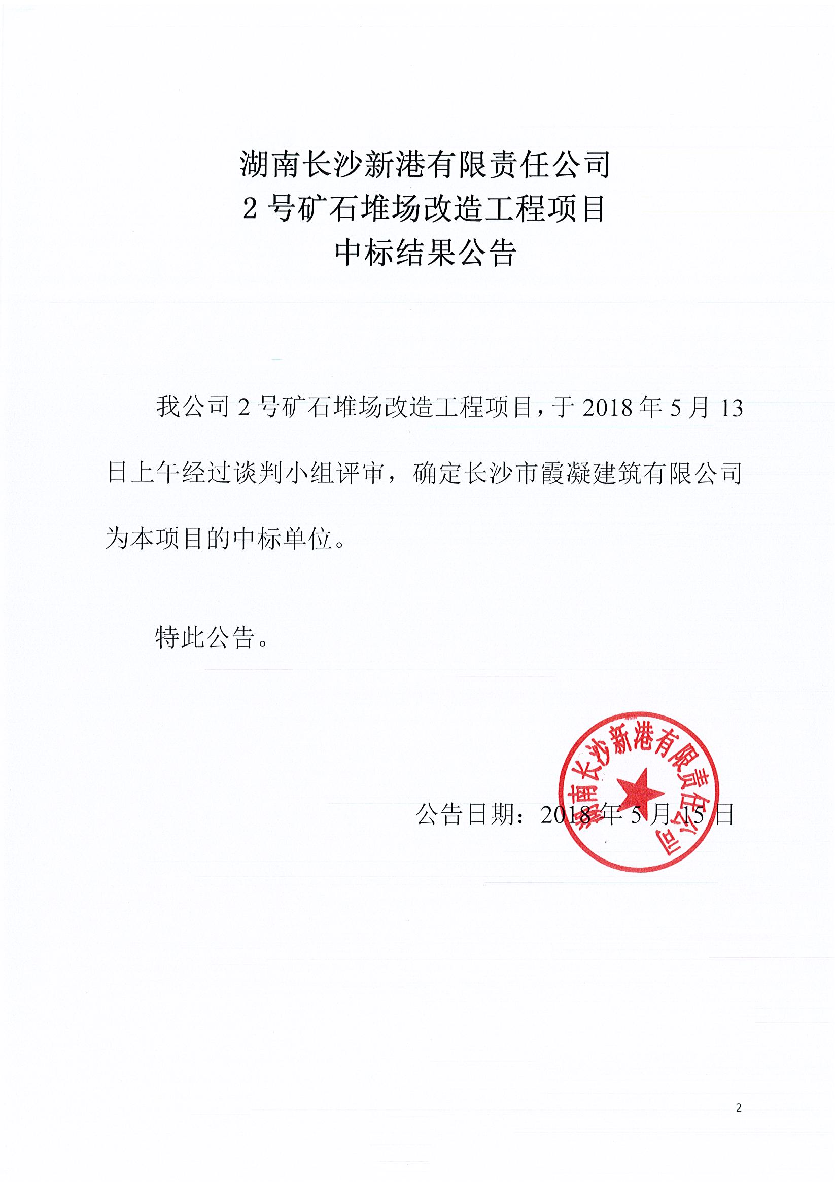 湖南長沙新港有限責(zé)任公司 2號礦石堆場改造工程項目中標(biāo)結(jié)果公告