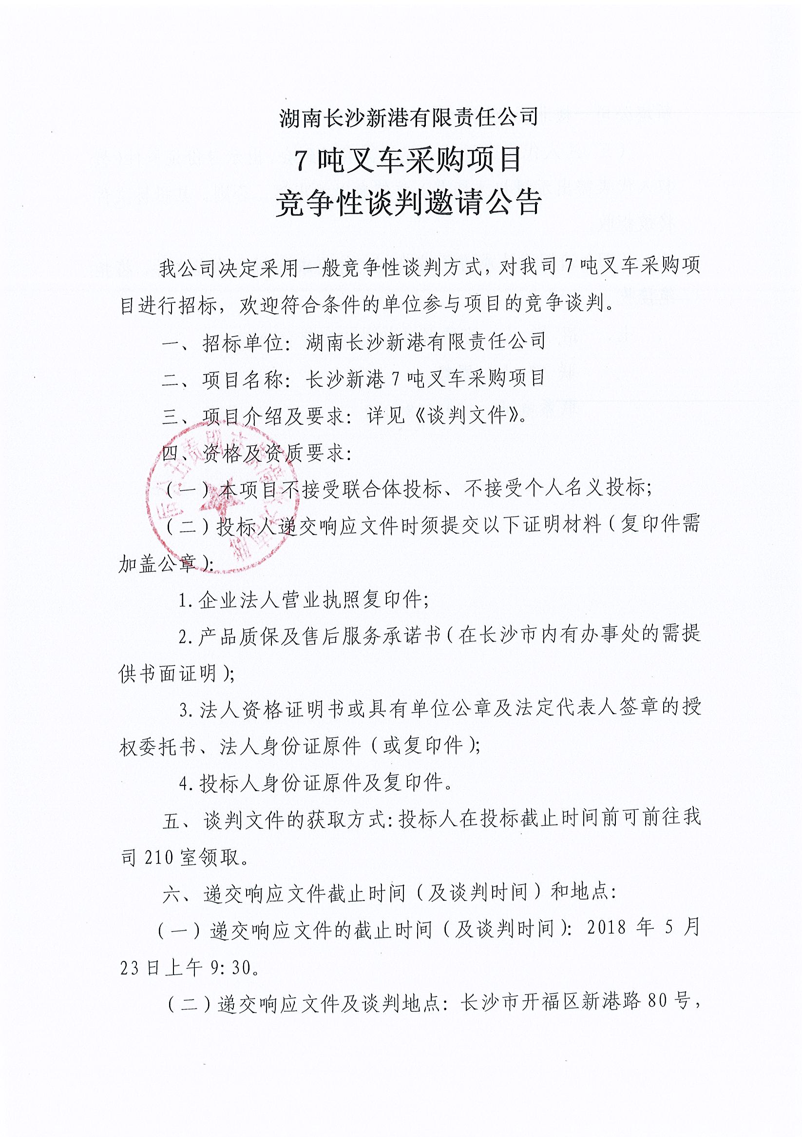 湖南長沙新港有限責(zé)任公司 7噸叉車采購項(xiàng)目競(jìng)爭(zhēng)性談判邀請(qǐng)公告