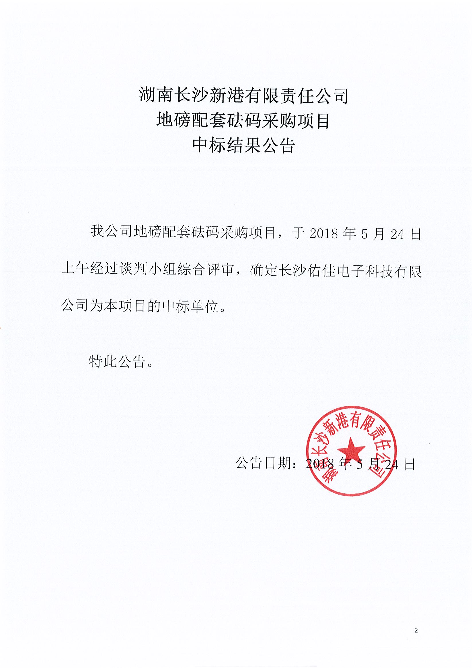 湖南長(zhǎng)沙新港有限責(zé)任公司 地磅套砝碼采購(gòu)項(xiàng)目中標(biāo)結(jié)果公告