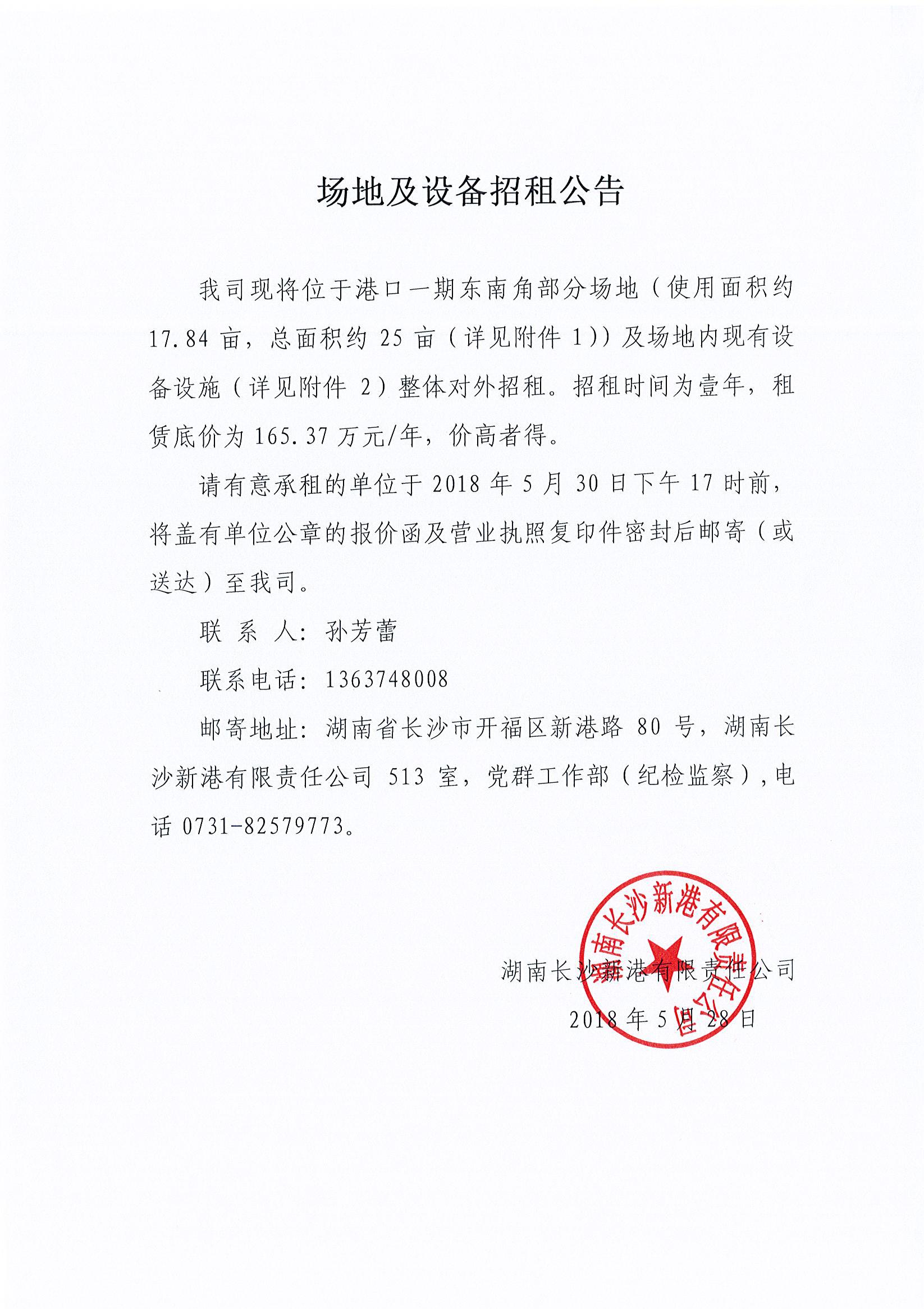 湖南長沙新港有限責(zé)任公司 場地及設(shè)備招租公告
