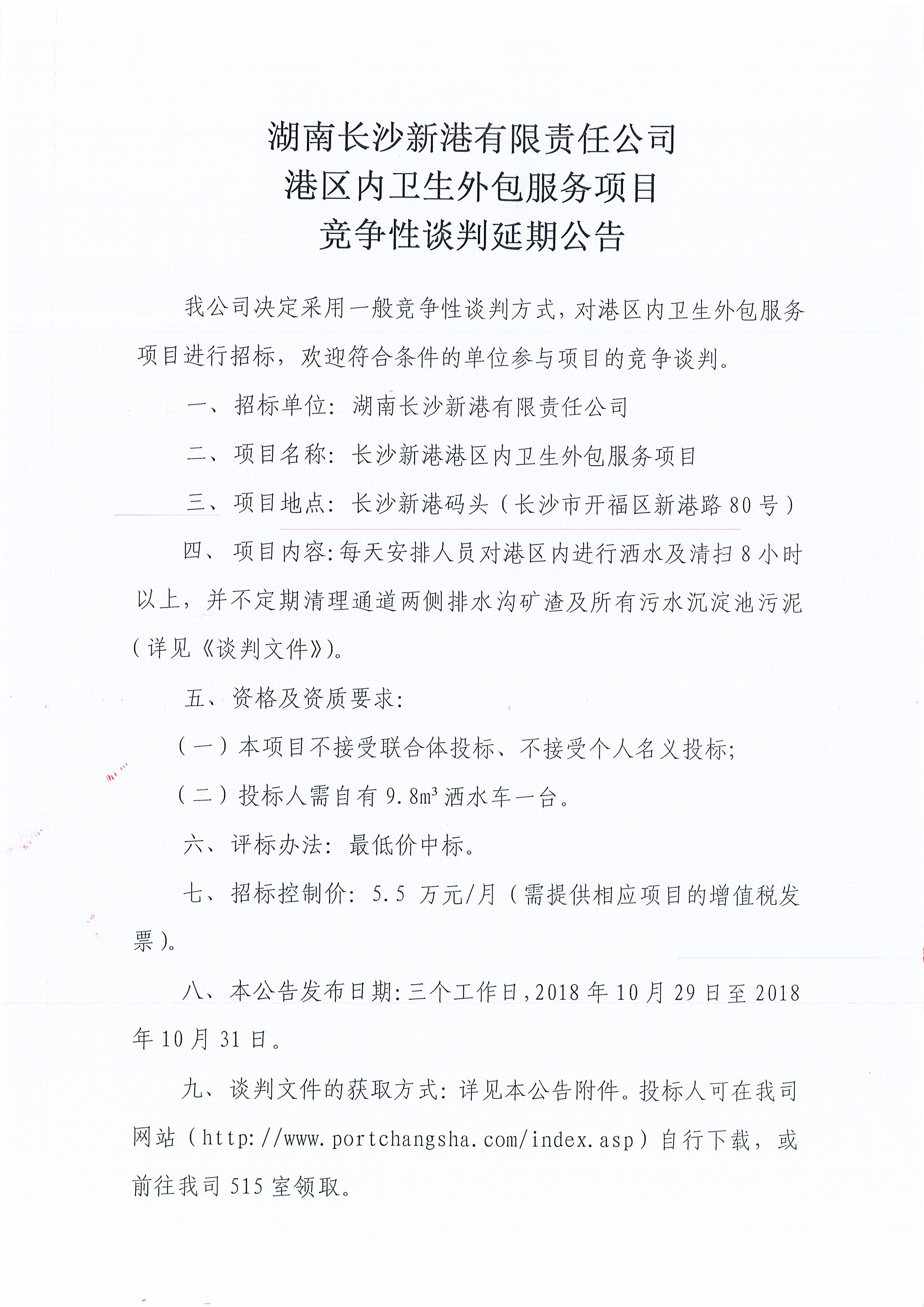 湖南長沙新港有限責(zé)任公司港區(qū)內(nèi)衛(wèi)生外包服務(wù)項目競爭性談判延期公告
