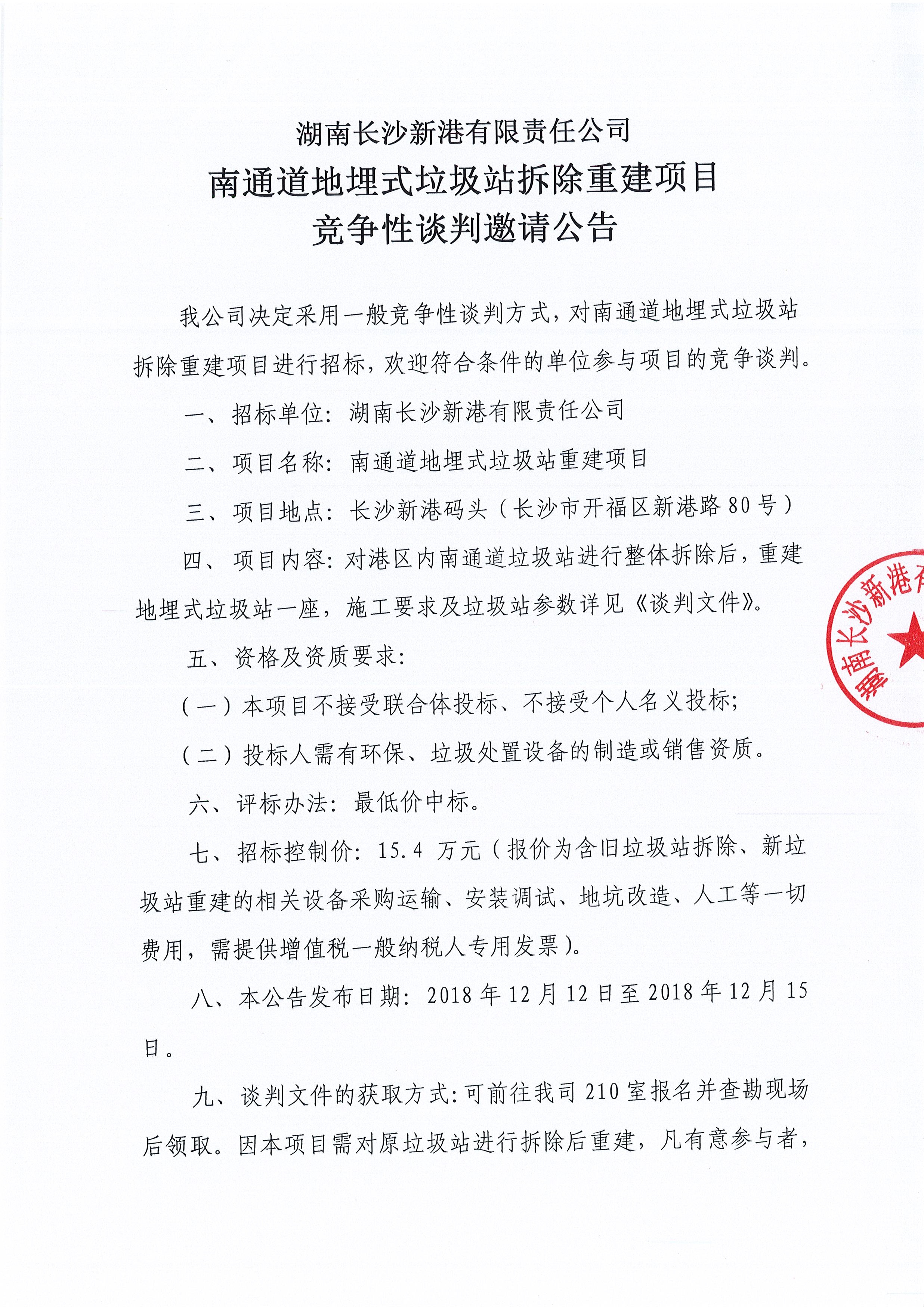 湖南長沙新港有限責任公司南通道地埋式垃圾站拆除重建項目競爭性談判邀請公告