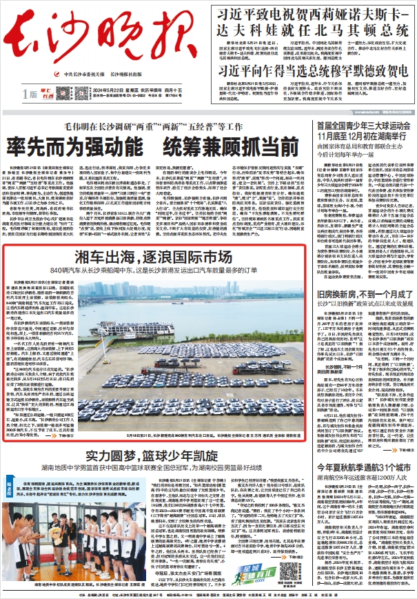 《長沙晚報》(2024年5月22日 第一版) 湘車出海,逐浪國際市場840輛汽車從長沙乘船闖中東,這是長沙新港發(fā)運出口汽車數(shù)量最多的訂單