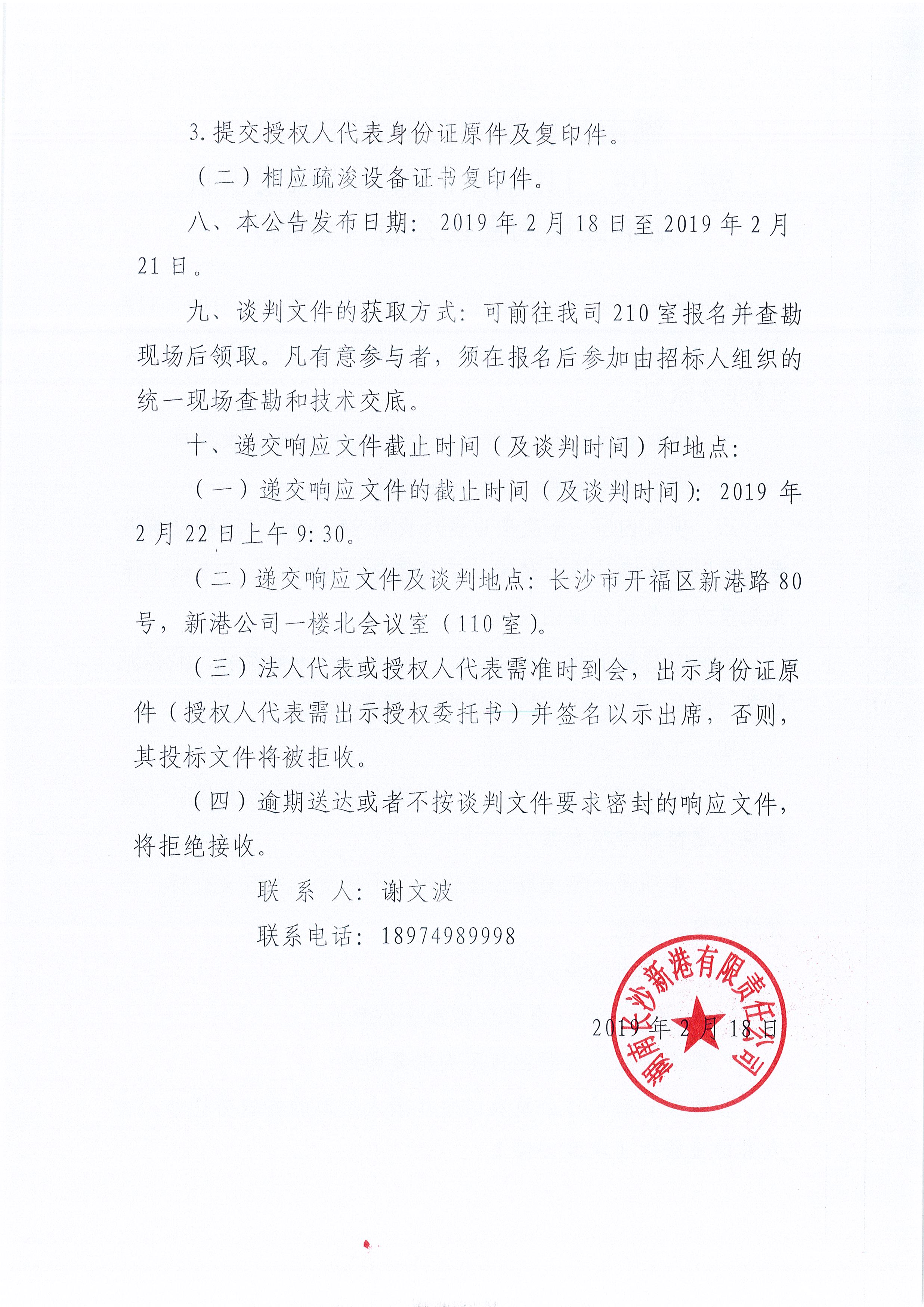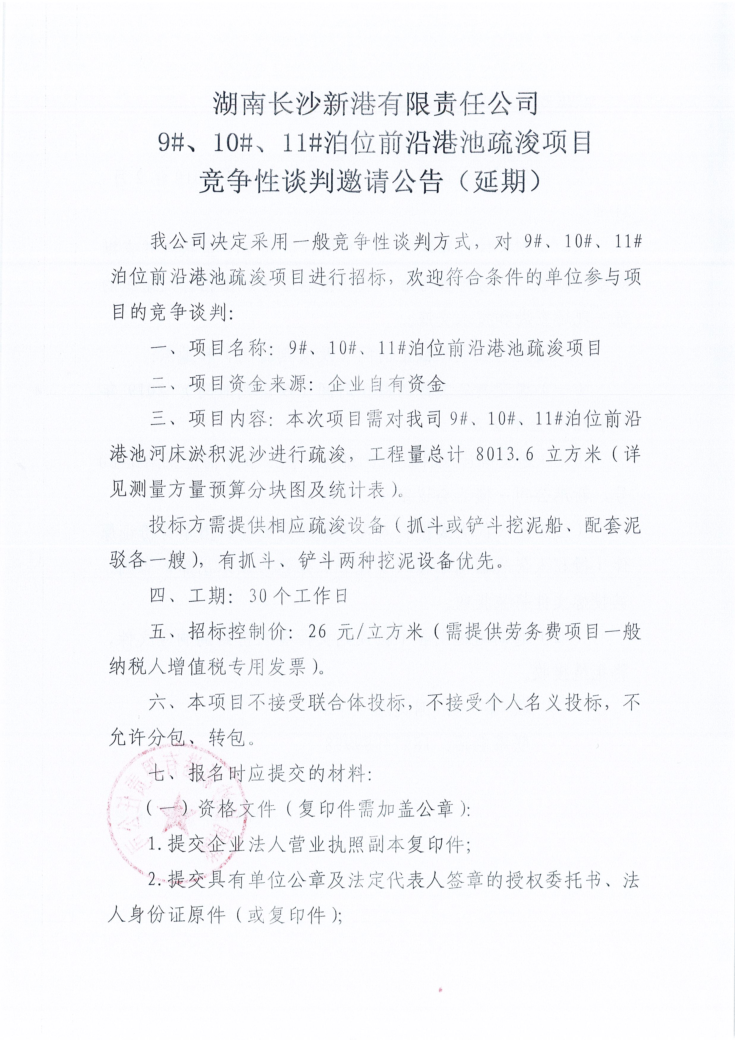 湖南長沙新港有限責(zé)任公司 9#、10#、11#泊位前沿港池疏浚項(xiàng)目競爭性談判邀請公告(延期)