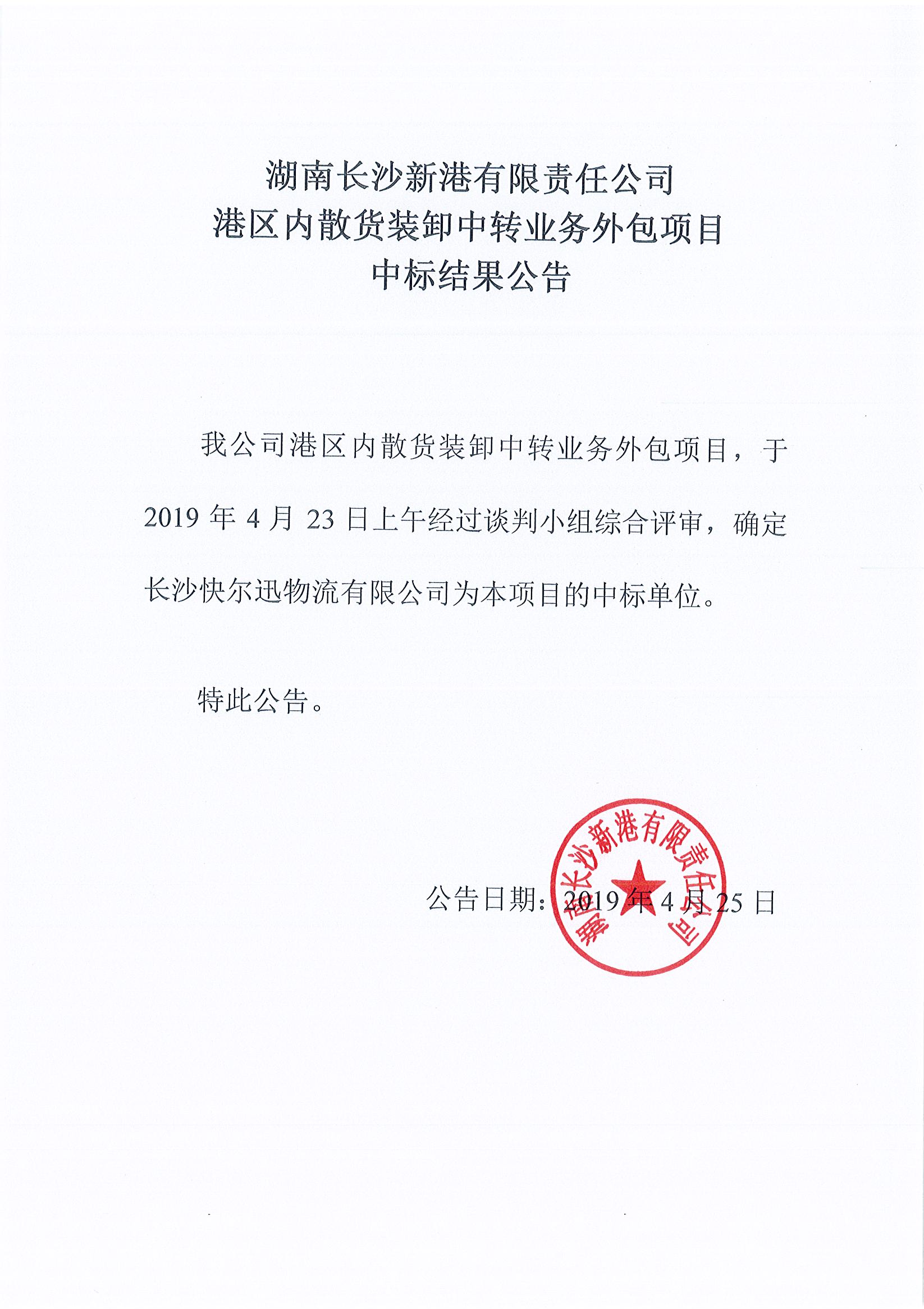 湖南長沙新港有限責(zé)任公司港區(qū)內(nèi)散貨裝卸中轉(zhuǎn)業(yè)務(wù)外包項(xiàng)目中標(biāo)結(jié)果公告