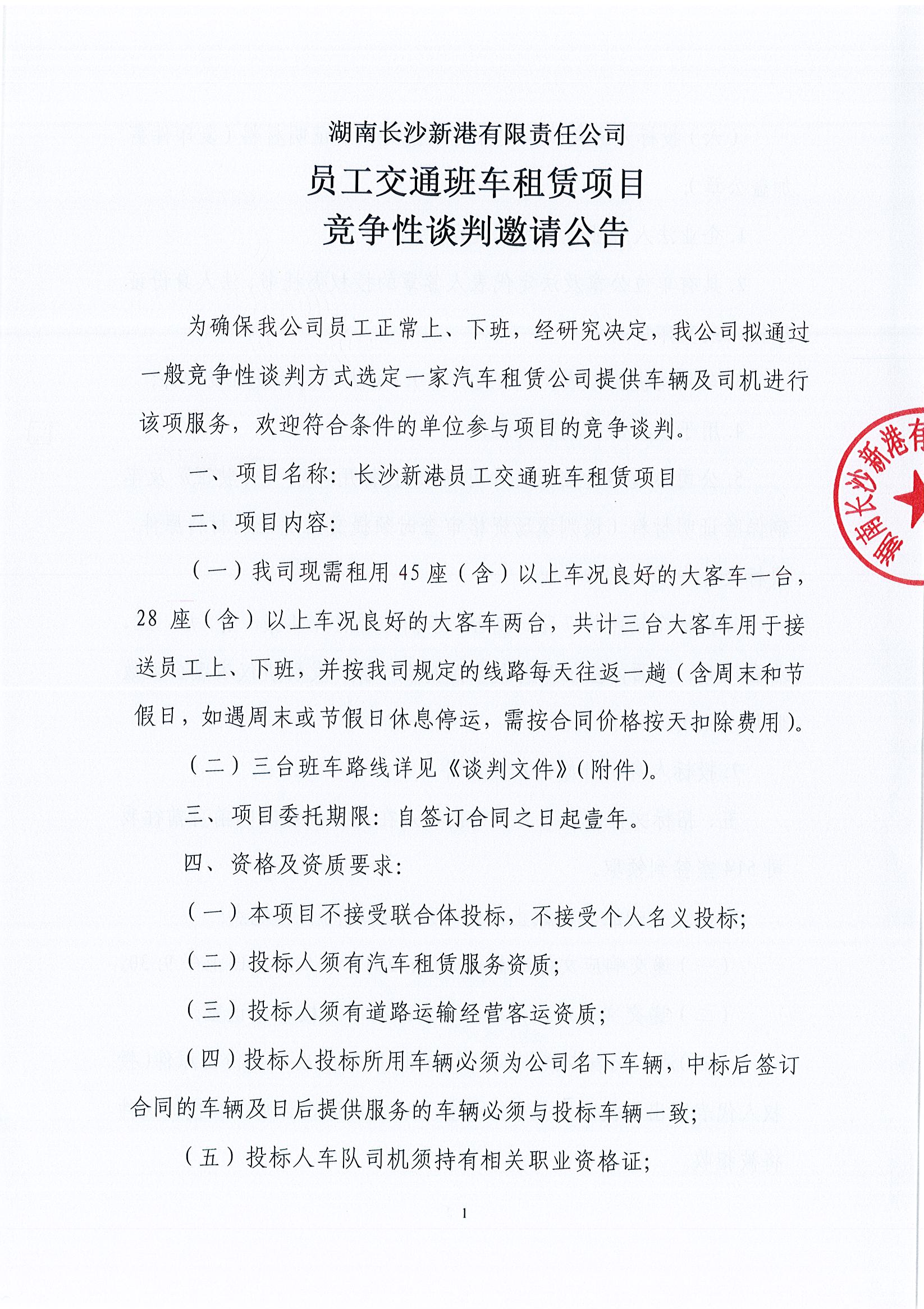 湖南長沙新港有限責任公司員工交通班車租賃項目競爭性談判邀請公告