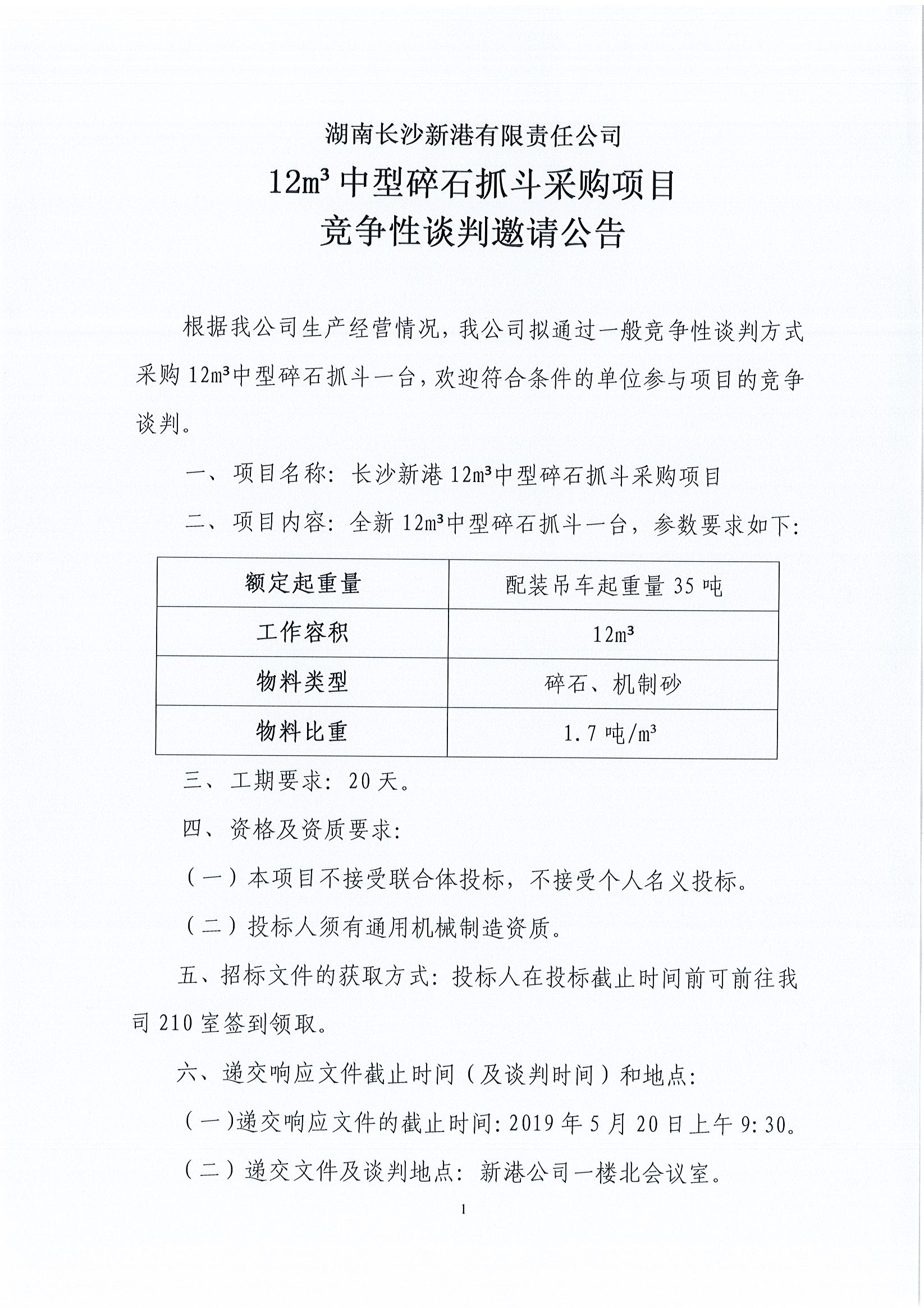湖南長沙新港有限責(zé)任公司12m³中型碎石抓斗采購項(xiàng)目競爭性談判邀請公告