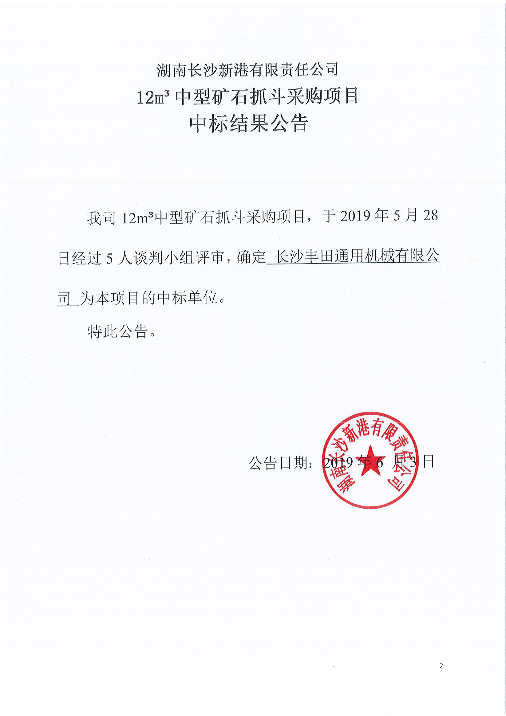湖南長沙新港有限責(zé)任公司12m³中型礦石抓斗采購項目中標結(jié)果公示