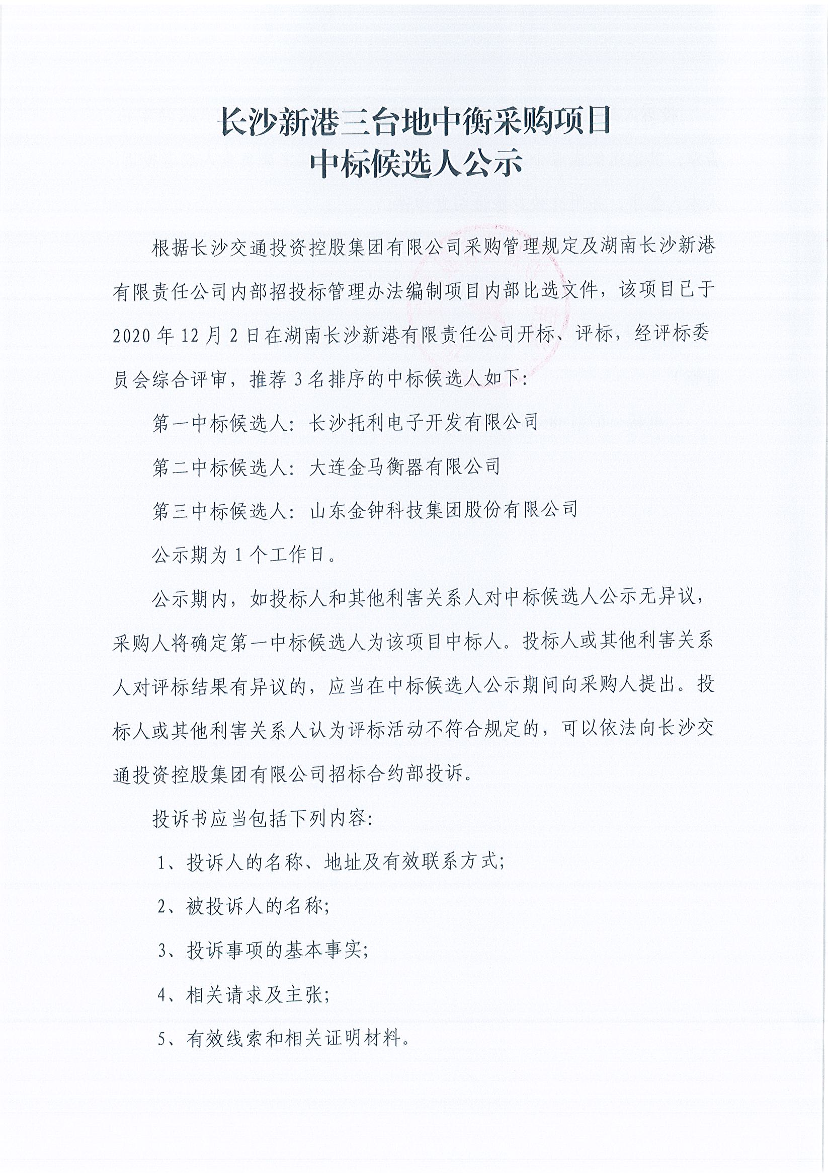 長(zhǎng)沙新港三臺(tái)地中衡采購(gòu)項(xiàng)目中標(biāo)候選人公示