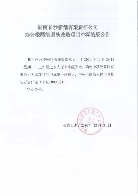 湖南長沙新港有限責任公司辦公樓網(wǎng)絡系統(tǒng)改造項目中標結果公告