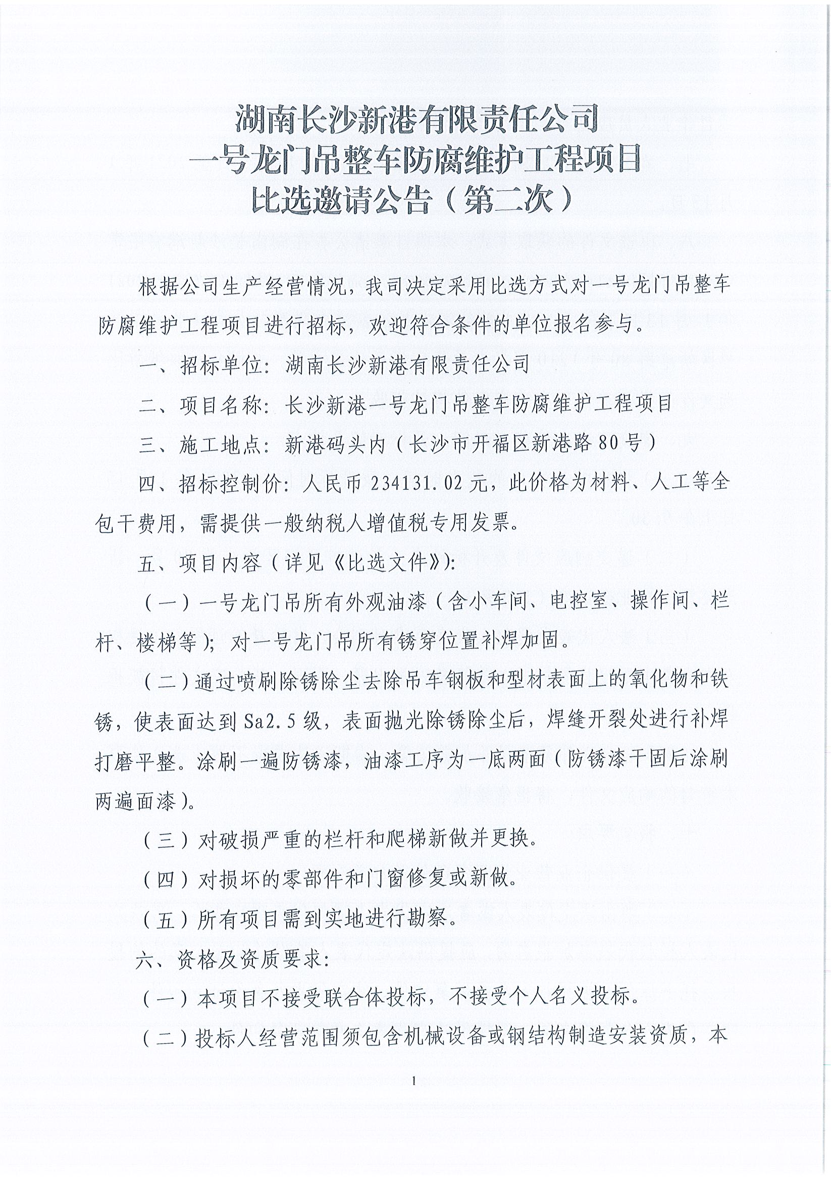 湖南長沙新港有限責(zé)任公司一號(hào)龍門吊整車防腐維護(hù)工程比選邀請(qǐng)公告(第二次)