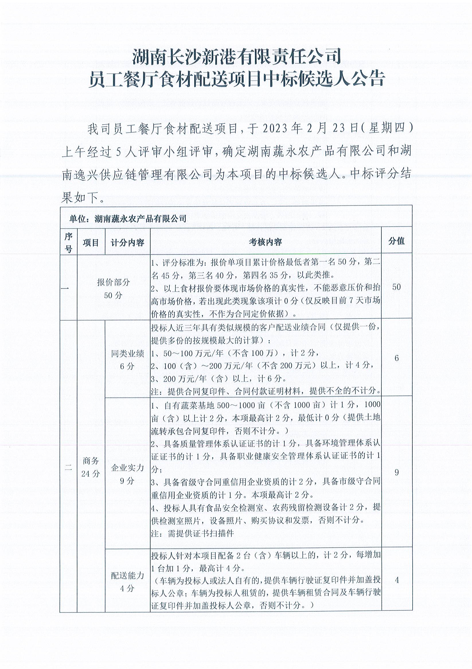員工餐廳食材配送項目中標(biāo)候選人公告