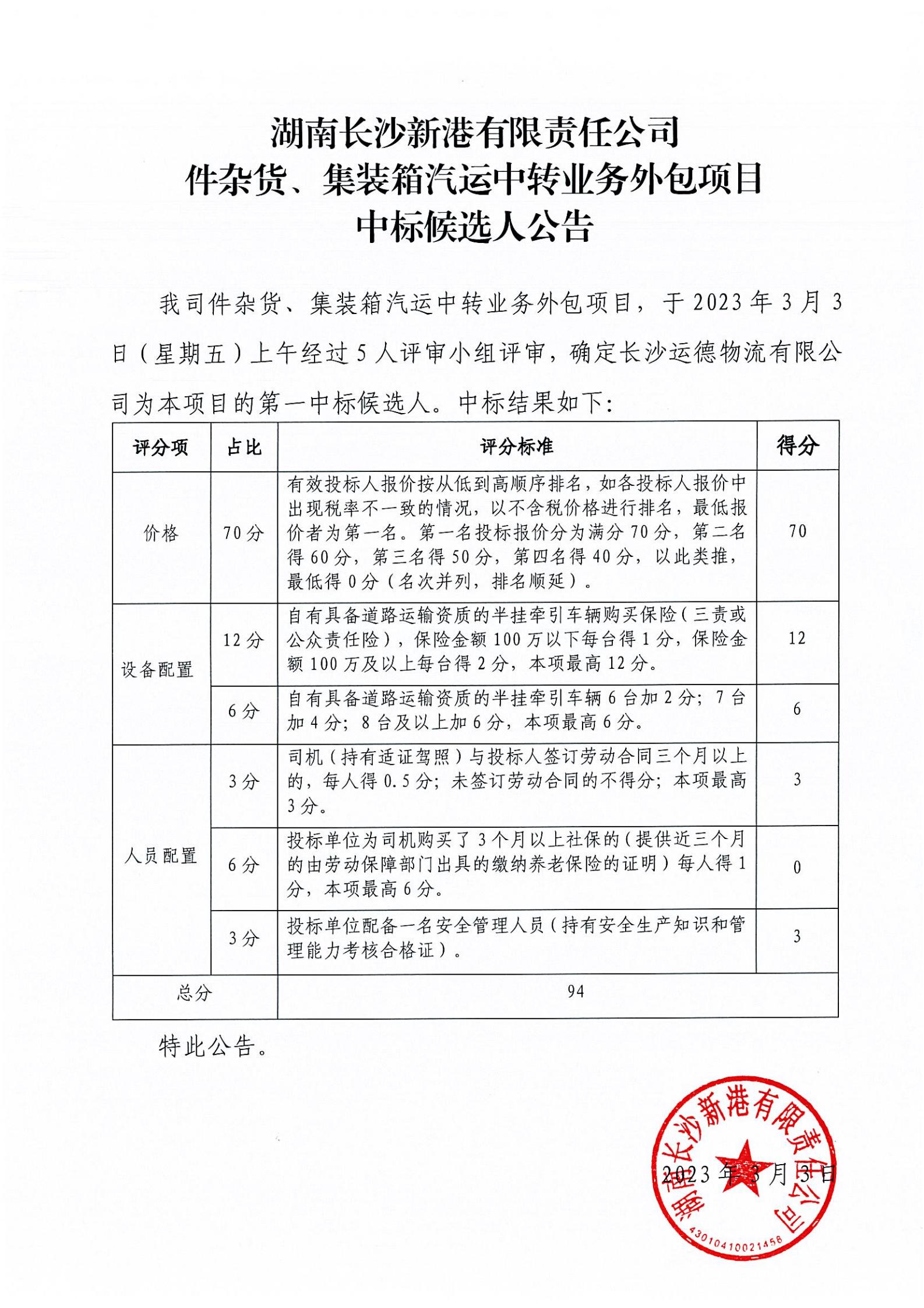 湖南長沙新港有限責(zé)任公司件雜貨、集裝箱汽運中轉(zhuǎn)業(yè)務(wù)外包項目中標(biāo)候選人公告