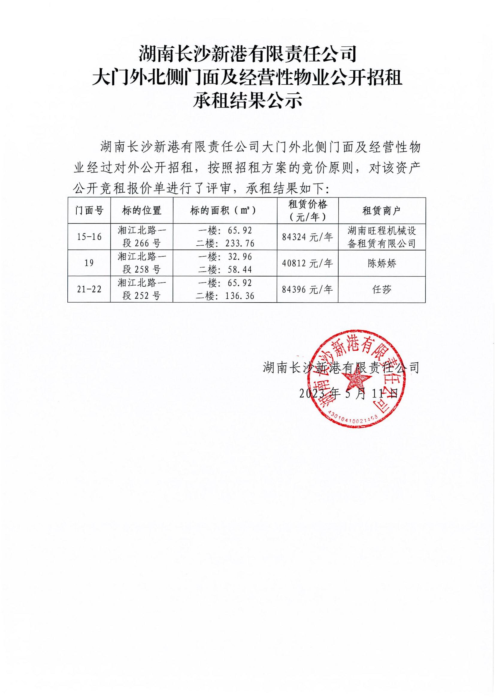 新港公司大門外北側(cè)門面及經(jīng)營性物業(yè)公開招租承租結(jié)果公示