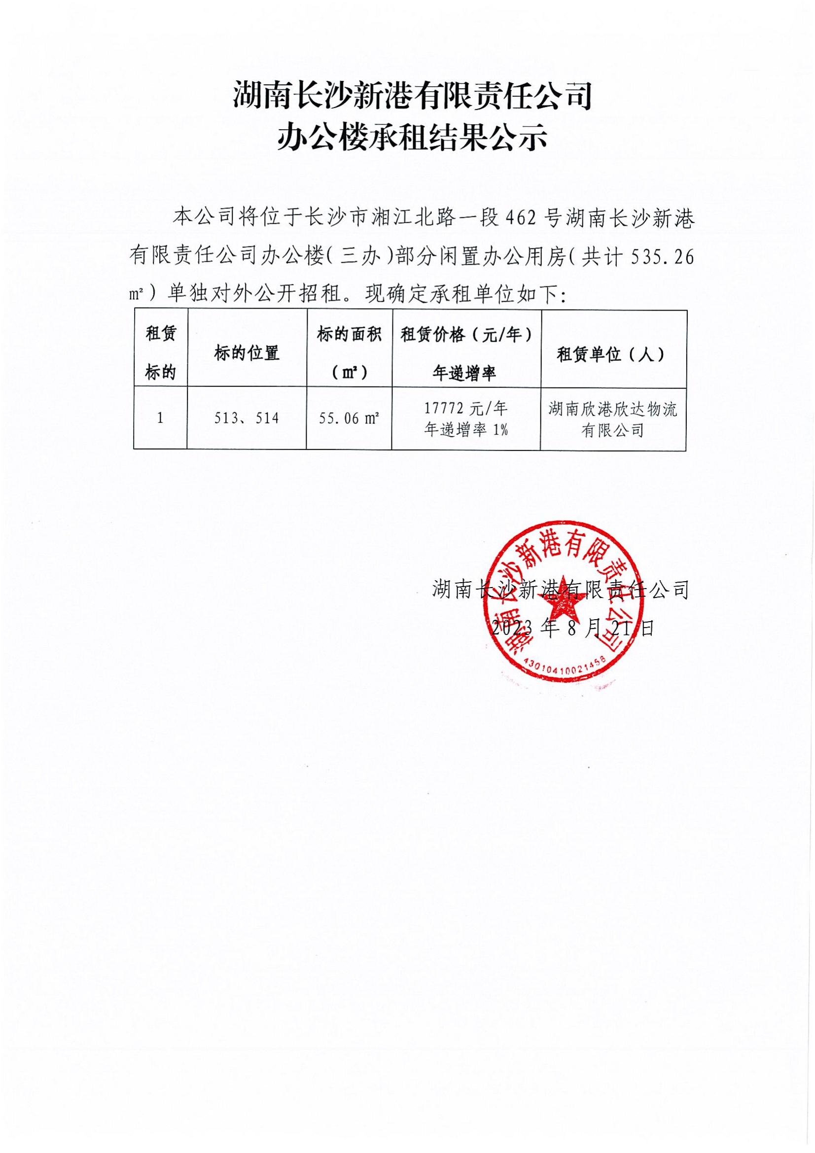 湖南長沙新港有限責任公司辦公樓承租結(jié)果公示