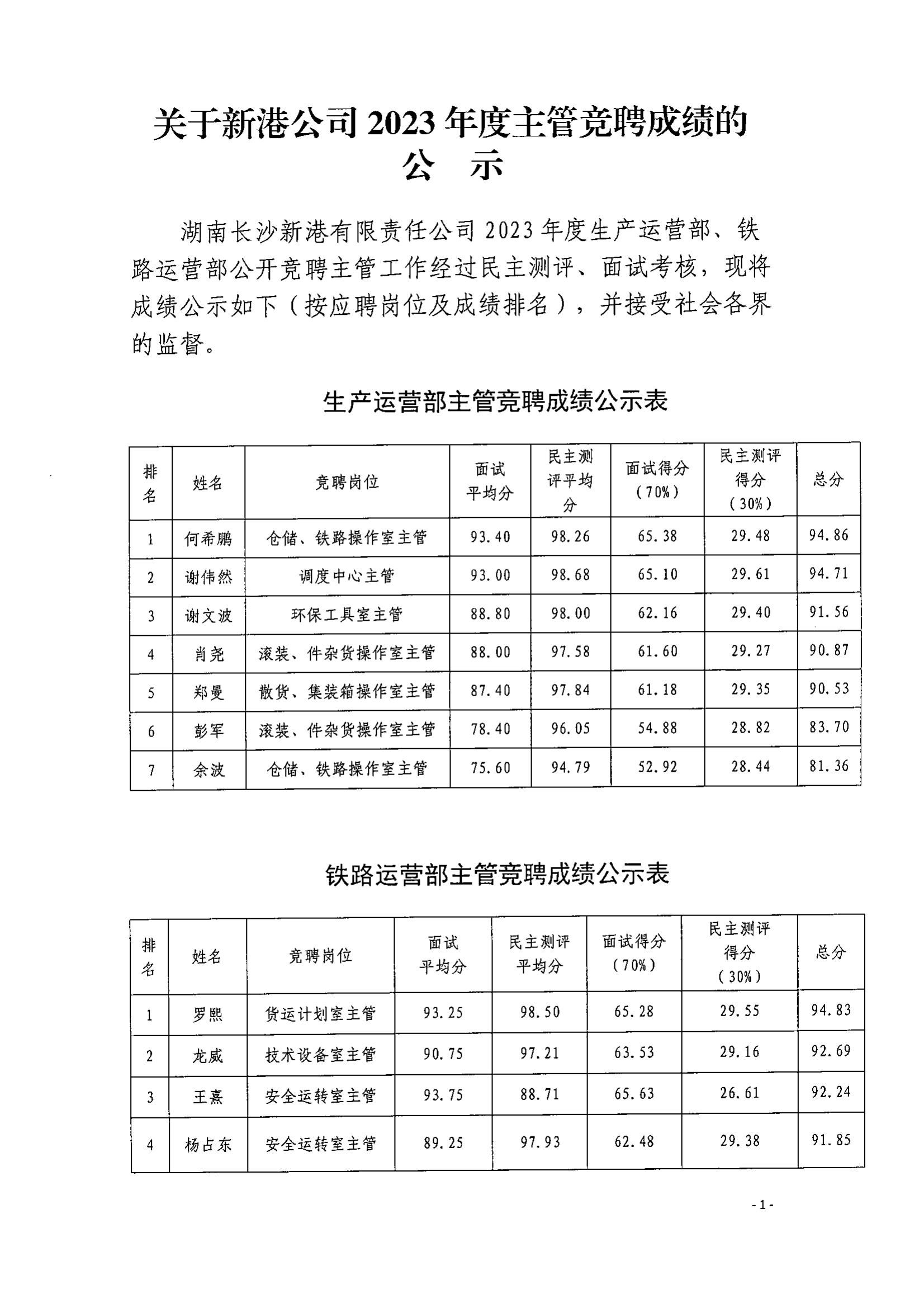 關(guān)于新港公司2023年度主管競(jìng)聘成績(jī)的公示