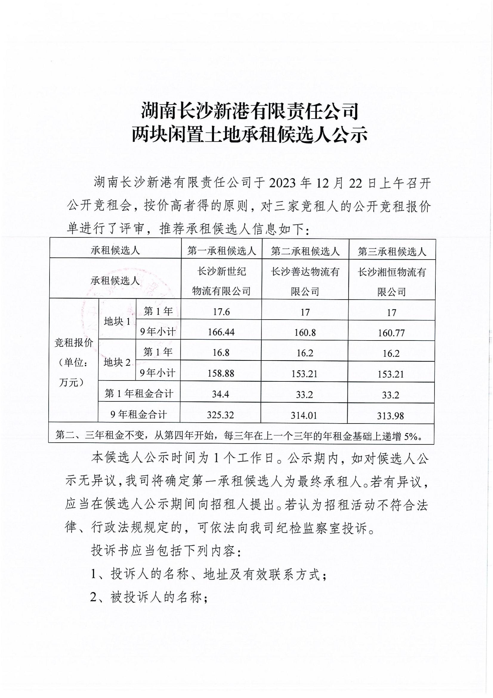 湖南長沙新港有限責任公司兩塊閑置土地承租候選人公示