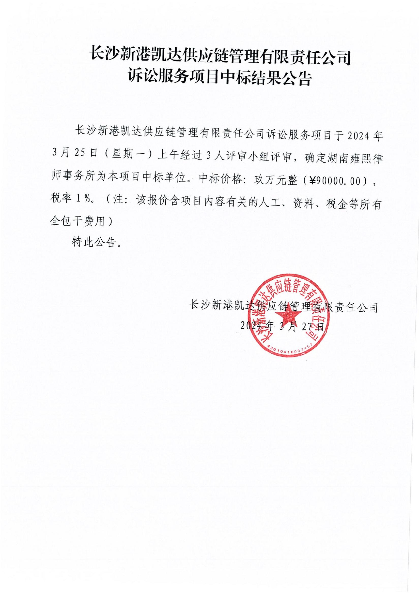 長沙新港凱達供應(yīng)鏈訴訟服務(wù)項目中標(biāo)結(jié)果公告