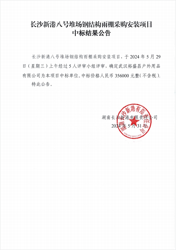長沙新港八號堆場鋼結(jié)構(gòu)雨棚采購安裝項目中標(biāo)結(jié)果公示