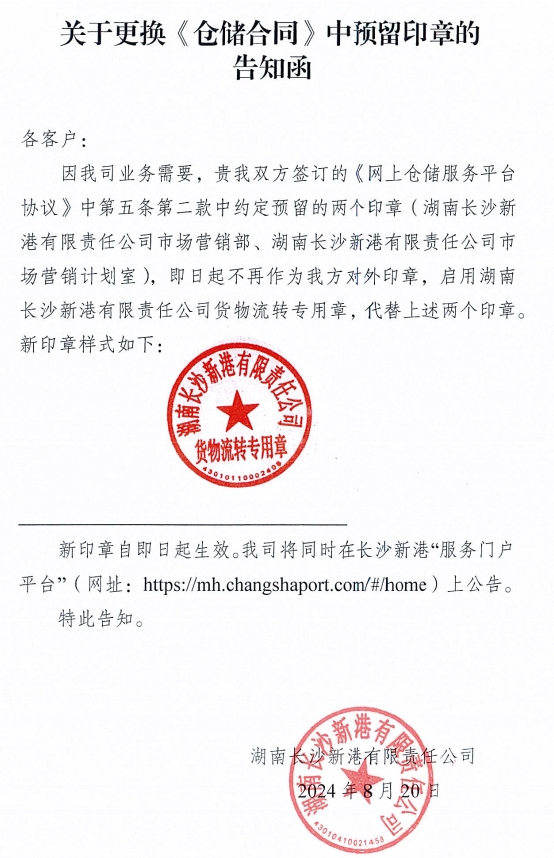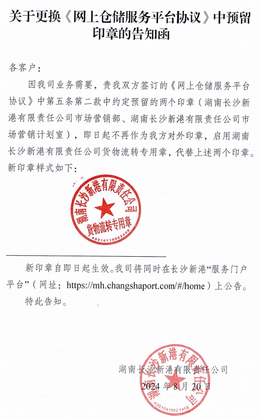 關(guān)于更換《倉儲合同》《網(wǎng)上倉儲服務(wù)平臺協(xié)議》中預(yù)留印章的告知函