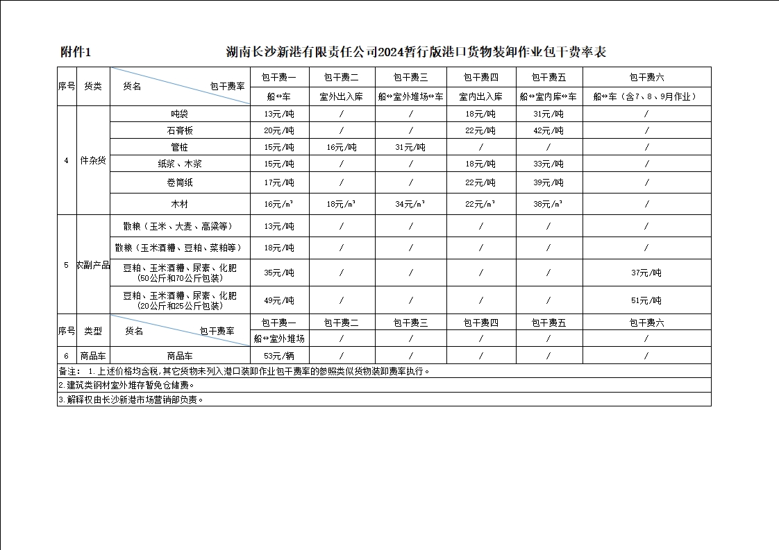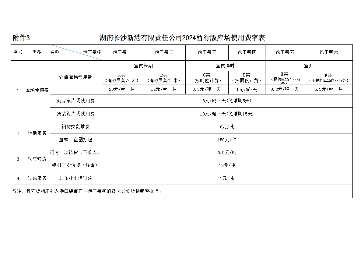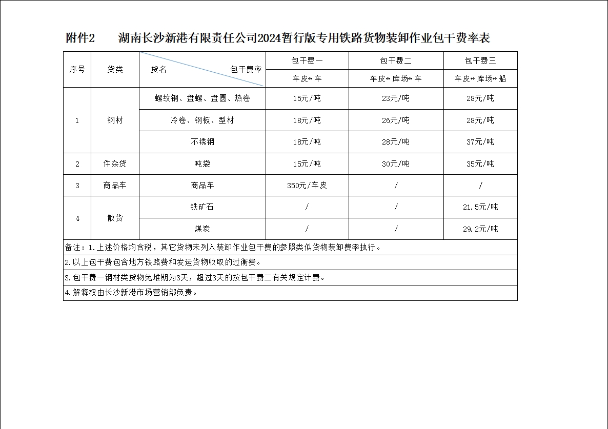 湖南長沙新港有限責(zé)任公司2024暫行版港口貨物裝卸作業(yè)包干費(fèi)率、2024暫行版專用鐵路貨物裝卸作業(yè)包干費(fèi)率、2024暫行版庫場使用費(fèi)率及2024暫行版裝卸作業(yè)包干費(fèi)率階梯價(jià)格方案